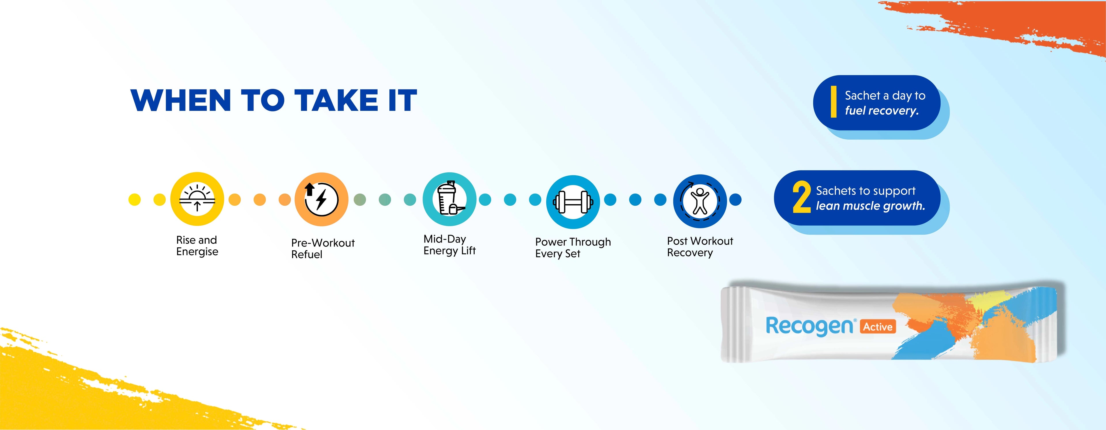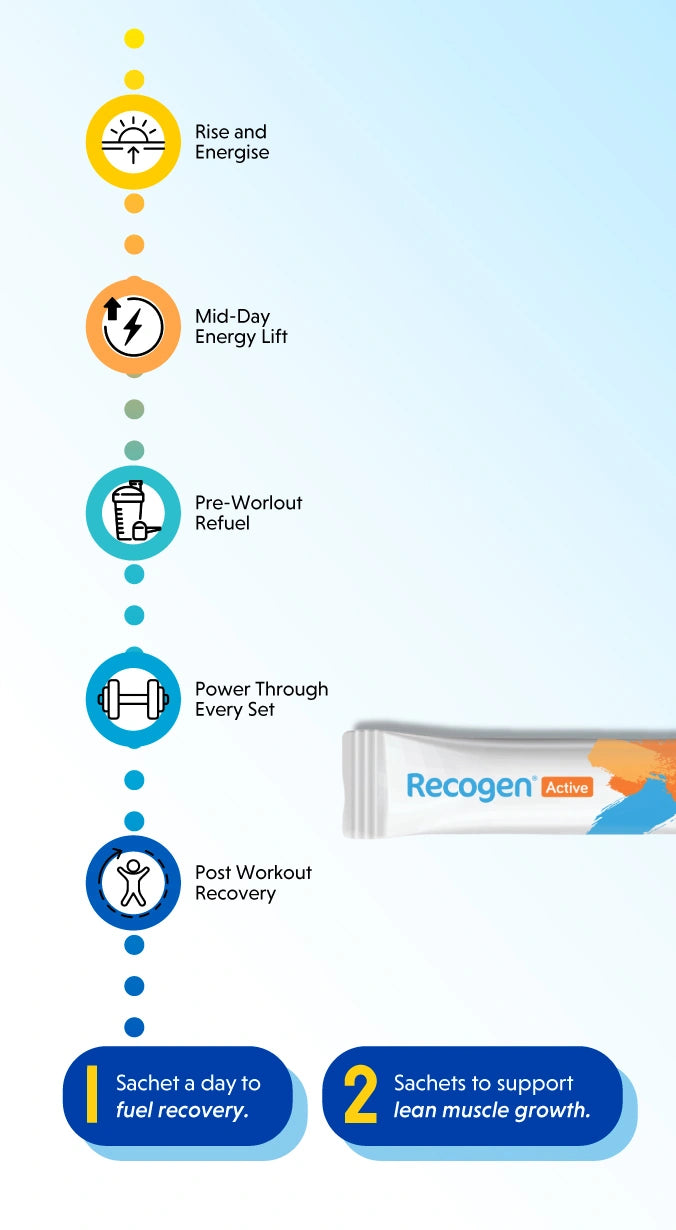 For best results, take 2 sachets of Recogen Active before or after your workout and feel the difference!