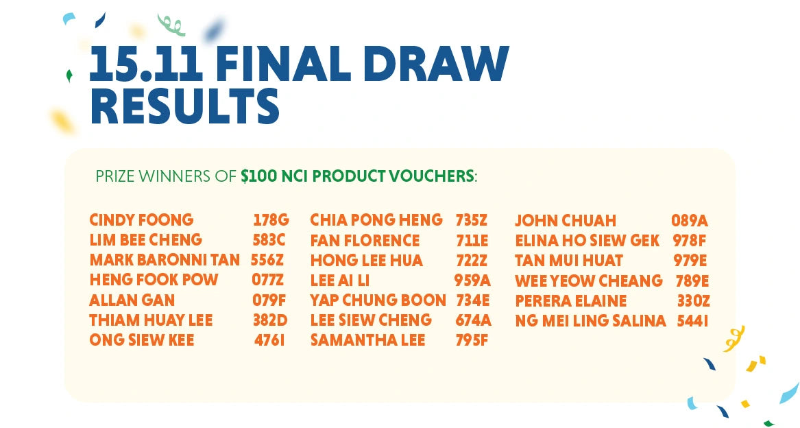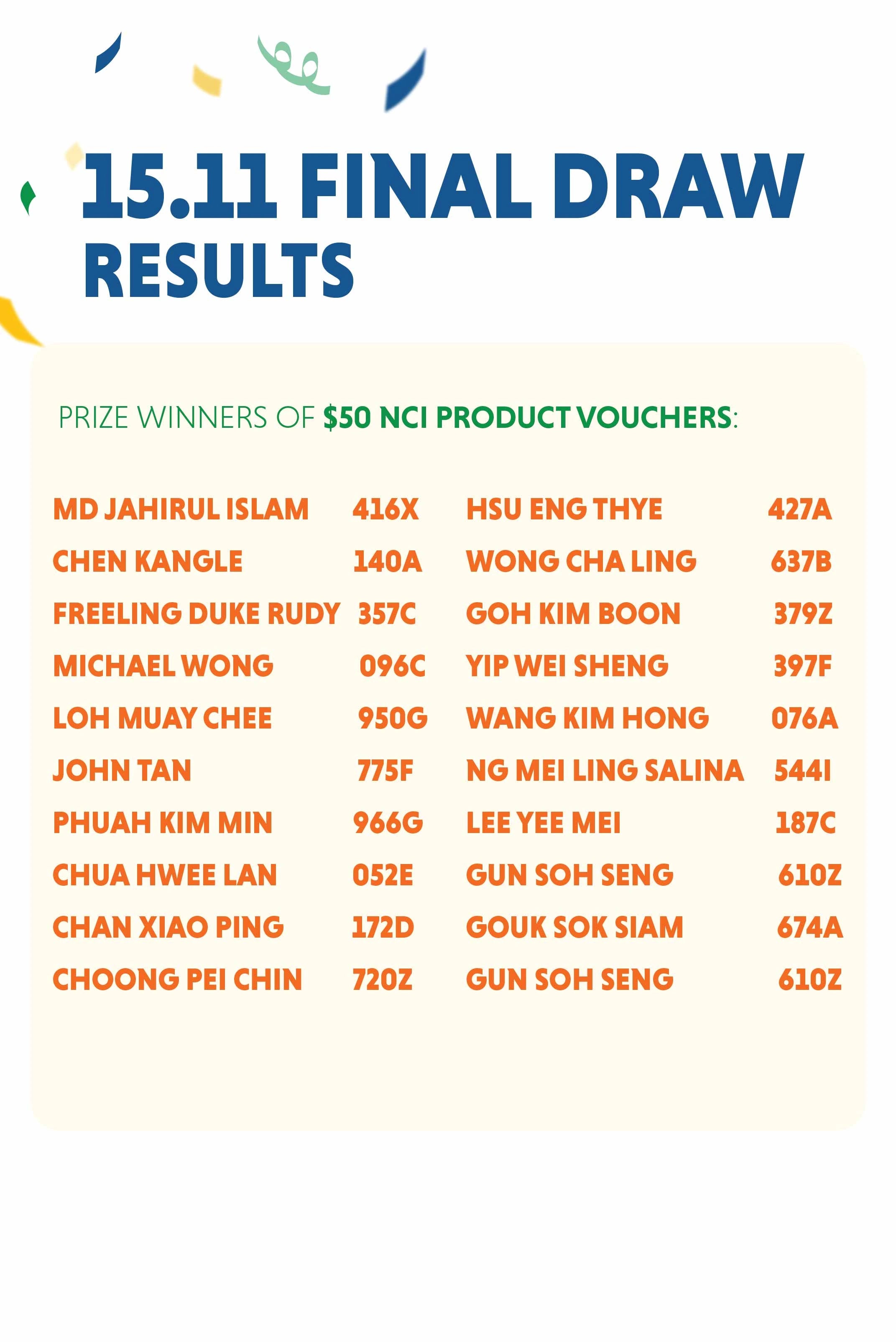 2.4. Send your entry to 9299 5566 via WhatsApp in the following format: NCI20 <FULL REGISTERED NAME> <RECEIPT NUMBER> <LAST 3 DIGITS + 1 LETER OF NRIC>, along with a photo of the receipt