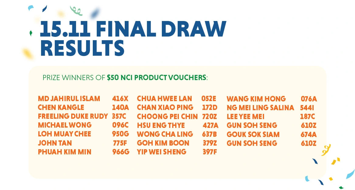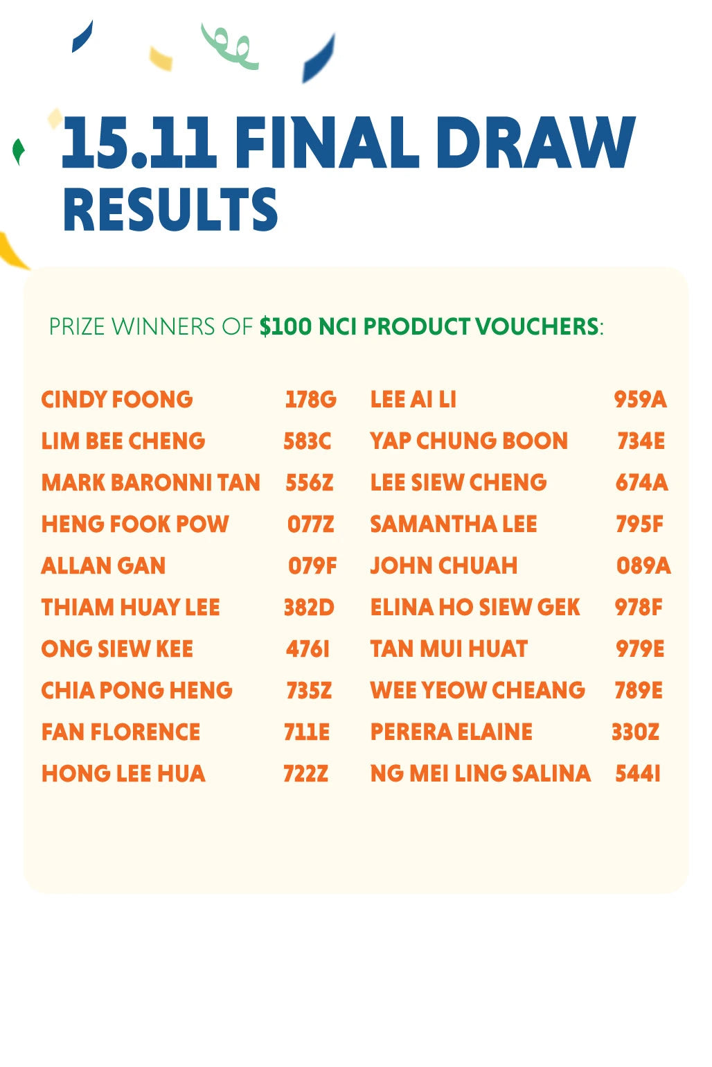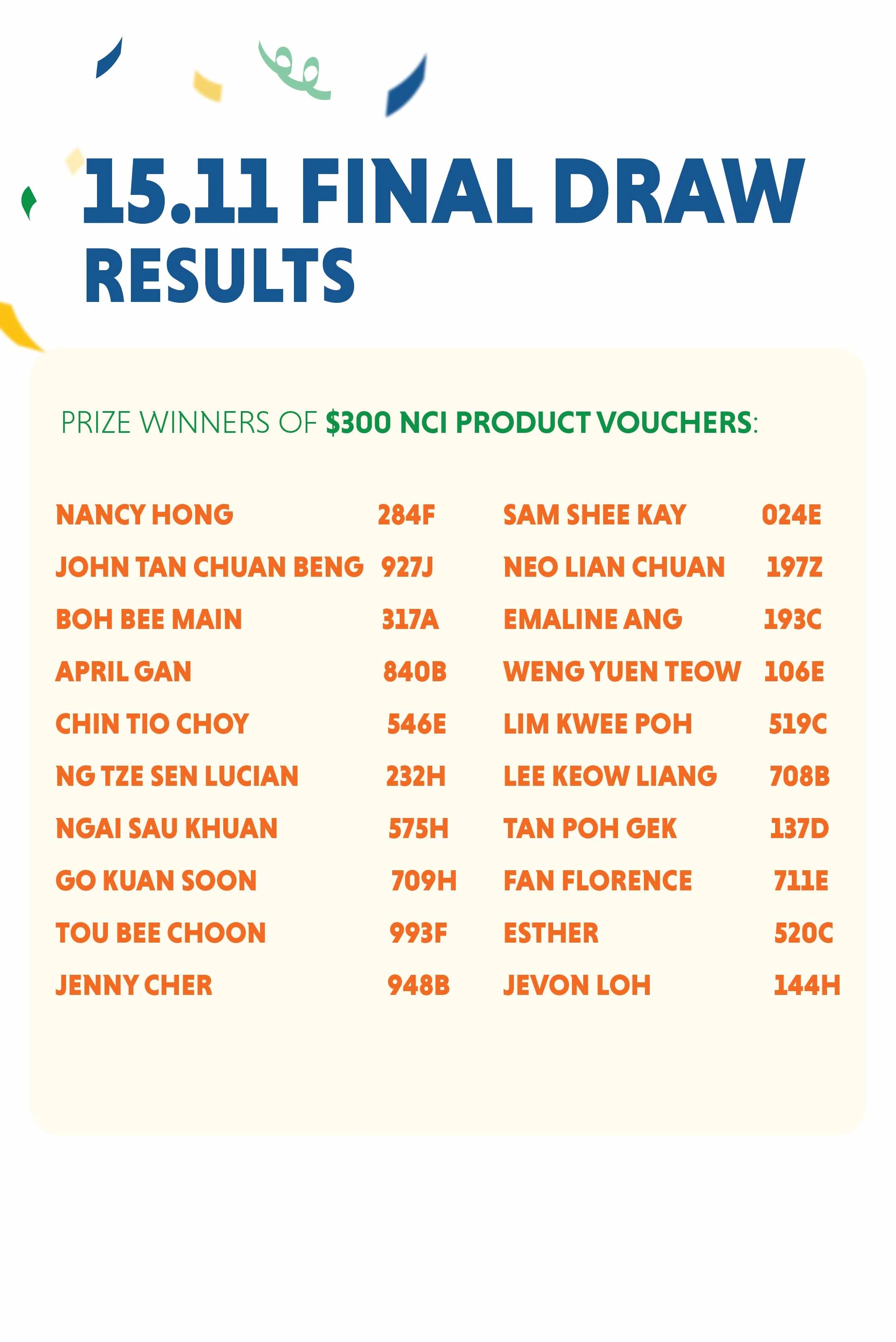1.1. The NCI 20th Anniversary’s “1st Mini Draw”, “2nd Mini Draw” and “Final Grand Draw” promotions(“Promotions”) are open to all Singapore citizens, Permanent Residents and Non-Permanent Residents residing in Singapore.
